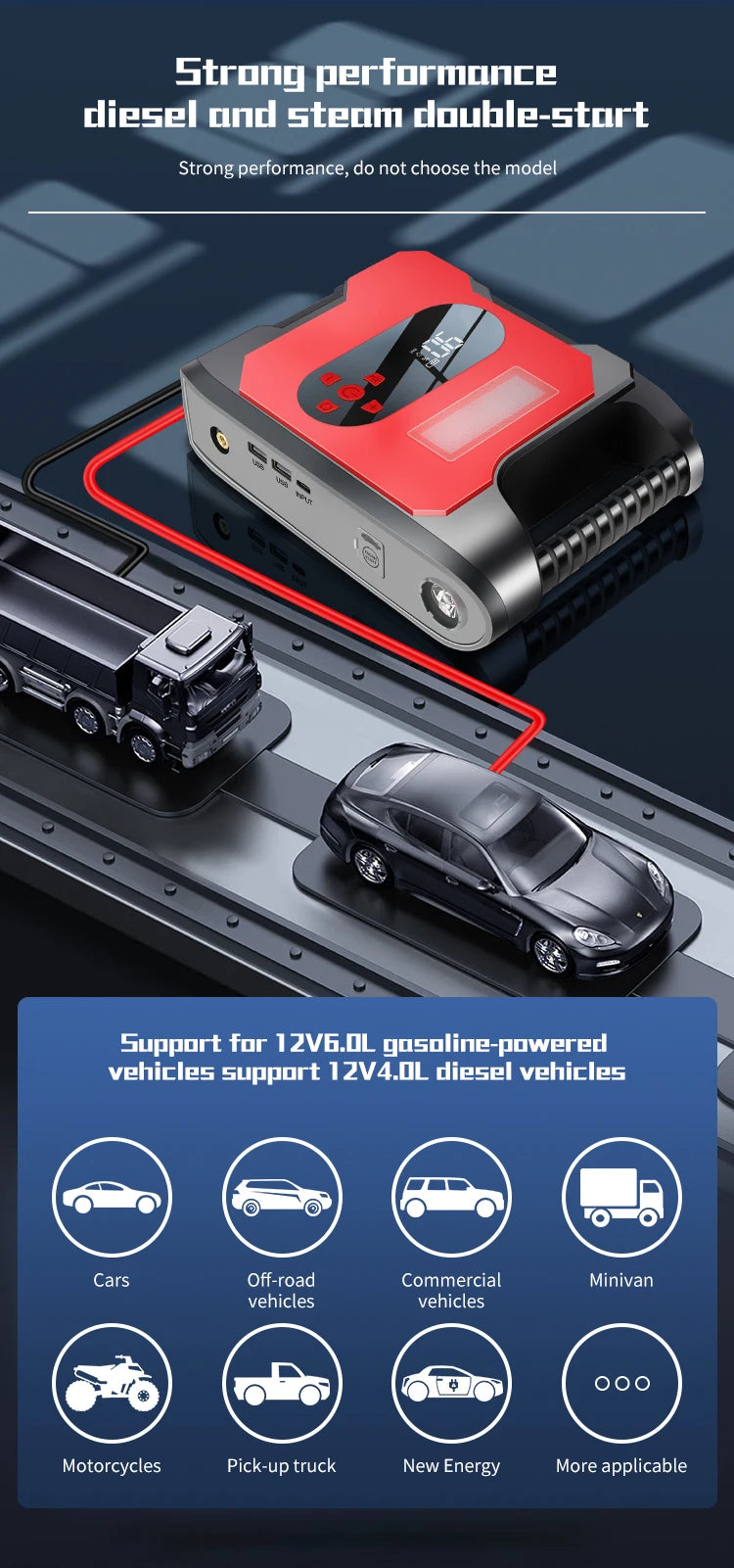 ¿Batería descargada? No hay problema. Arranca vehículos de gasolina y diésel fácilmente sin necesidad de cables ni asistencia externa.